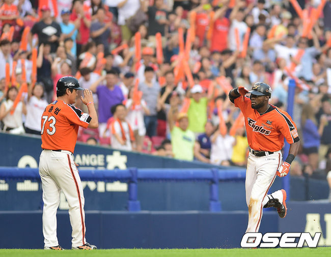 4회초 한화 공격 선두타자로 나선 피에가 우월 솔로포를 날리고 그라운드를 돌며 이종범 코치와 인사를 나누고 있다.