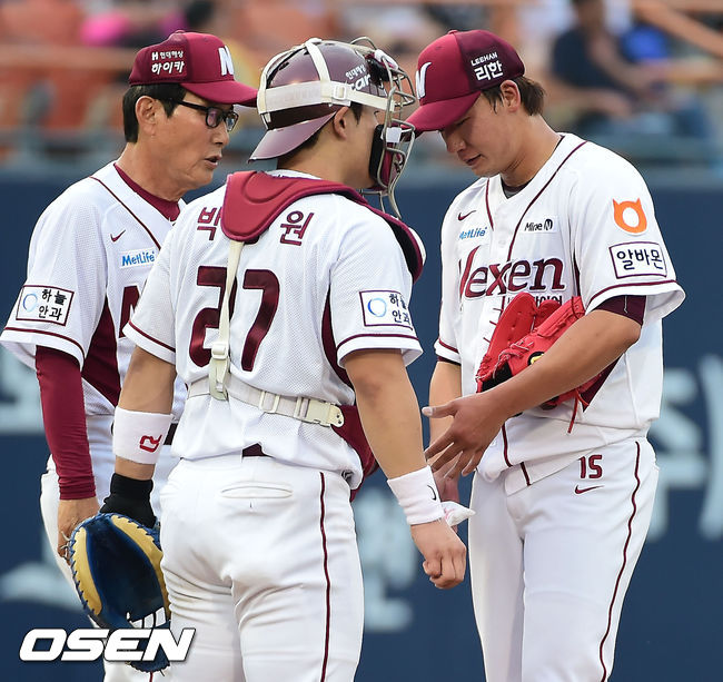 12일 오후 서울 목동야구장에서 열린 '2014 한국야쿠르트 세븐 프로야구' 넥센 히어로즈와 NC 다이노스의 경기, 4회초 1사 주자 없는 상황에서 NC 모창민에게 연타석 솔로 홈런을 맞은 넥센 선발 오재영이 마운드 위에서 류영수 투수코치와 얘기를 나누고 있다.