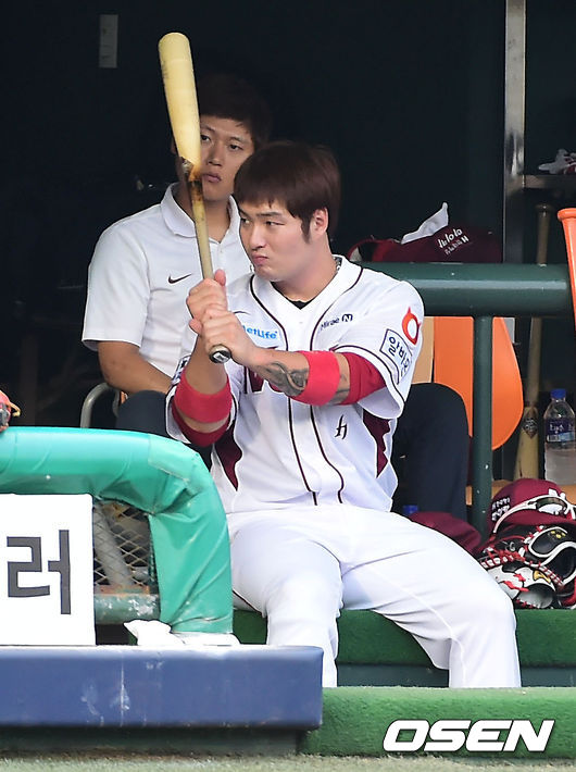 12일 오후 서울 목동야구장에서 열린 '2014 한국야쿠르트 세븐 프로야구' 넥센 히어로즈와 NC 다이노스의 경기, 선발 라인업에서 제외된 넥센 박병호가 덕아웃에서 배트를 들고 스윙 연습을 하고 있다.