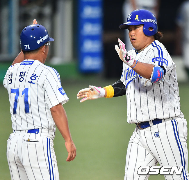 12일 오후 대구구장에서 열린 2014 한국야쿠르트 세븐 프로야구 삼성 라이온스와 SK 와이번스의 경기, 3회말 2사 1루 삼성 박석민이 2점 홈런을 날리고 김평호 코치와 하이파이브를 하고 있다