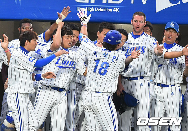 12일 오후 대구구장에서 열린 2014 한국야쿠르트 세븐 프로야구 삼성 라이온스와 SK 와이번스의 경기, 3회말 2사 1루 삼성 박석민이 2점 홈런을 날리고 동료들의 축하를 받고 있다.