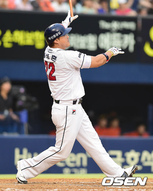 4회말 두산 공격 무사 1루 상황 홍성흔이 추격의 중월 투런포를 날리고 있다.