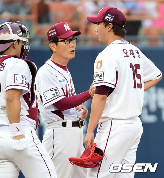 12일 오후 서울 목동야구장에서 열린 '2014 한국야쿠르트 세븐 프로야구' 넥센 히어로즈와 NC 다이노스의 경기, 5회초 무사 주자 1루 넥센 선발 오재영이 강판 당하고 있다.
