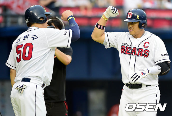 4회말 두산 공격 무사 1루 상황 홍성흔이 추격의 중월 투런포를 날리고 홈을 밟은 뒤 김현수와 인사를 나누고 있다.