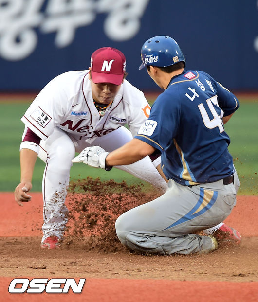 12일 오후 서울 목동야구장에서 열린 '2014 한국야쿠르트 세븐 프로야구' 넥센 히어로즈와 NC 다이노스의 경기, 5회초 무사 주자 1루 NC 테임즈 타석에서 1루 주자 나성범이 2루 도루에 실패하고 있다.