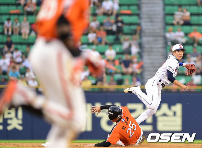 5회초 한화 공격 1사 1, 2루 상황 피에의 병살타 때 두산 유격수 허경민이 주자 최진행을 포스아웃 시킨 뒤 1루로 송구하고 있다.