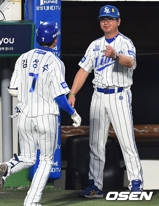 12일 오후 대구구장에서 열린 2014 한국야쿠르트 세븐 프로야구 삼성 라이온스와 SK 와이번스의 경기, 4회말 1사 2루 삼성 김상수가 2점 홈런을 날리고 류중일 감독의 축하를받고 있다.