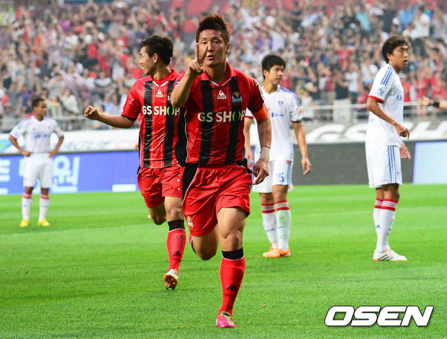 12일 오후 서울월드컵경기장에서 '현대오일뱅크 K리그 클래식 2014' 15라운드 FC 서울과 수원 삼성의 경기, 전반 43분 서울 김진규가 몰리나의 코너킥을 헤딩으로 골로 연결시키고 세레모니를 하고 있다.