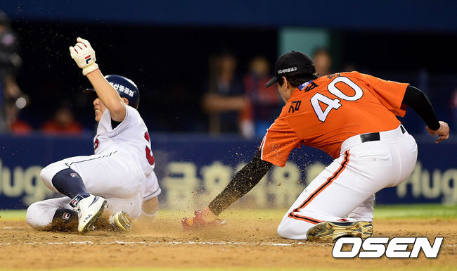 5회말 두산 공격 2사 2루 상황 김현수 타석 때 한화 선발 김혁민의 폭투를 틈타 2루주자 정수빈이 홈까지 내달려 세이프 되고 있다.