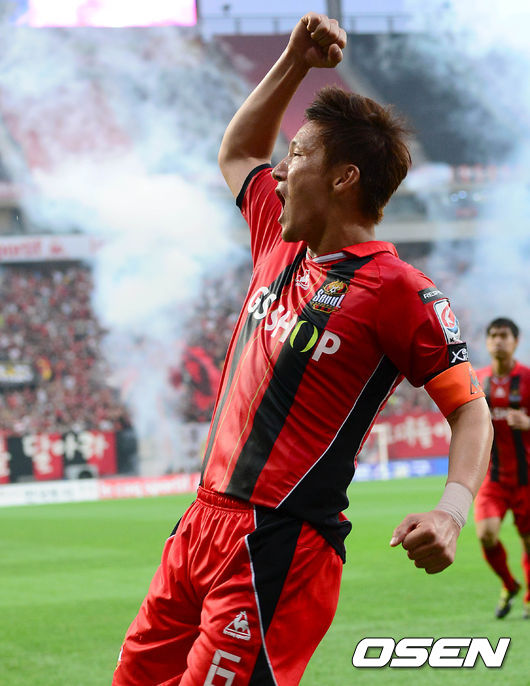 12일 오후 서울월드컵경기장에서 '현대오일뱅크 K리그 클래식 2014' 15라운드 FC 서울과 수원 삼성의 경기, 전반 43분 서울 김진규가 몰리나의 코너킥을 헤딩으로 골로 연결시키고 세레모니를 하고 있다.