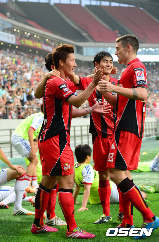 12일 오후 서울월드컵경기장에서 '현대오일뱅크 K리그 클래식 2014' 15라운드 FC 서울과 수원 삼성의 경기, 전반 43분 서울 김진규가 몰리나의 코너킥을 헤딩으로 골로 연결시키고 동료들과 기쁨을 나누고 있다.