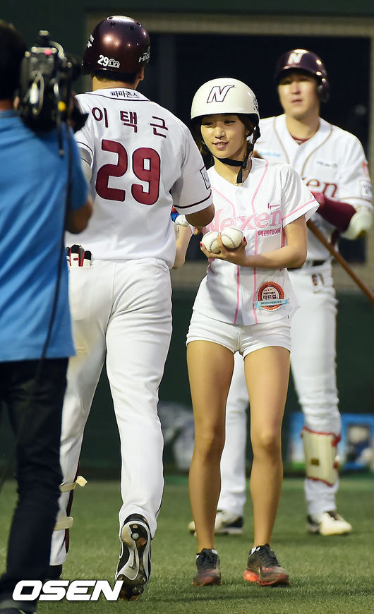 12일 오후 서울 목동야구장에서 열린 '2014 한국야쿠르트 세븐 프로야구' 넥센 히어로즈와 NC 다이노스의 경기, 6회말 1사 주자 없는 상황에서 넥센 이택근이 우월 솔로 홈런을 날린 후 홈에서 넥센 배트걸 신슬아에게 인형을 받고 있다.