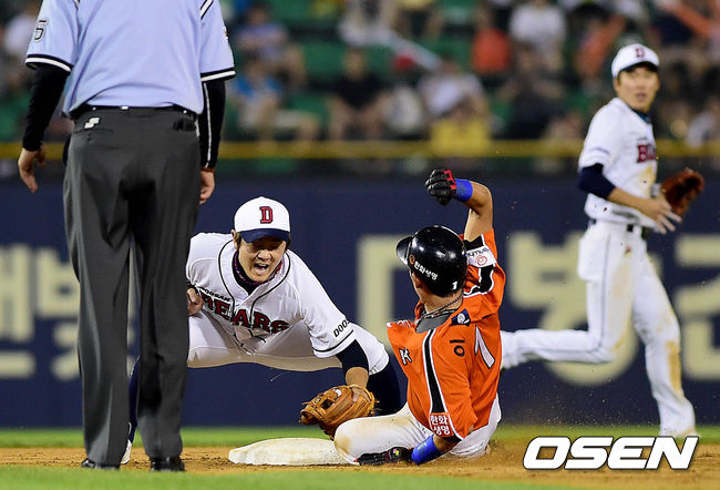 7회초 한화 공격 2사 1루 상황 최진행 타석 때 2루 도루를 시도한 주자 이용규가 두산 2루수 최주환의 태그에 걸려 아웃되고 있다.