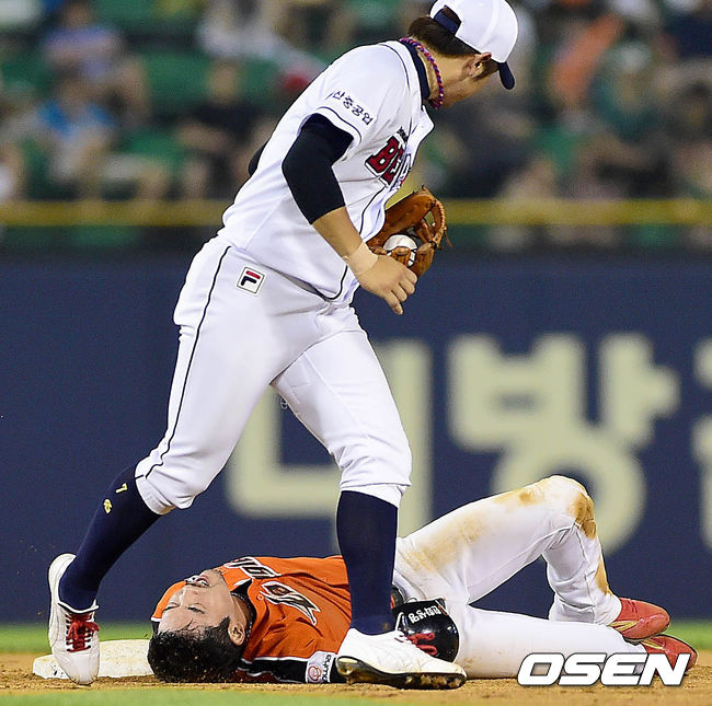 7회초 한화 공격 2사 1루 상황 최진행 타석 때 2루 도루를 시도한 주자 이용규가 두산 2루수 최주환의 태그에 걸려 아웃된 뒤 아쉬워하고 있다.