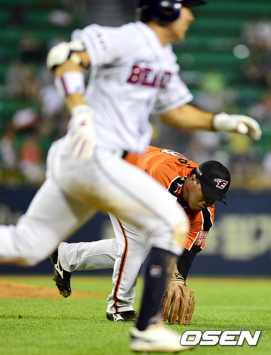 7회말 두산 공격 1사 1루 상황 정수빈의 번트 안타 때 한화 투수 마일영이 타구를 잡아내고 있다. 타자주자는 세이프.