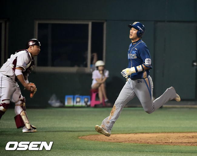12일 오후 서울 목동야구장에서 열린 '2014 한국야쿠르트 세븐 프로야구' 넥센 히어로즈와 NC 다이노스의 경기, 8회초 2사 주자 3루 넥센 김영민의 와일드 피칭때 3루주자 이상호가 홈을 밟고 있다.