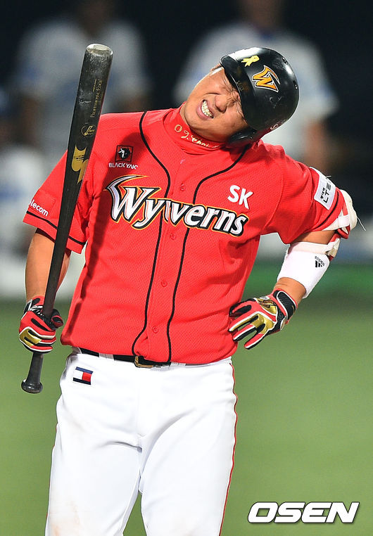 12일 오후 대구구장에서 열린 2014 한국야쿠르트 세븐 프로야구 삼성 라이온스와 SK 와이번스의 경기 8회초 삼성 김건한의 투구에 맞은 SK 최정이 고통스러워하고 있다