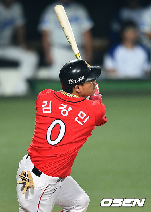 12일 오후 대구구장에서 열린 2014 한국야쿠르트 세븐 프로야구 삼성 라이온스와 SK 와이번스의 경기 8회초 2사 1,2루 SK 김강민이 2타점 적시타를 날리고 있다