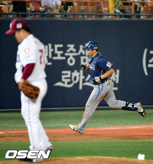 12일 오후 서울 목동야구장에서 열린 '2014 한국야쿠르트 세븐 프로야구' 넥센 히어로즈와 NC 다이노스의 경기, 9회초 1사 주자 없는 상황에서 NC 나성범이 중월 솔로 홈런을 날린 후 그라운드를 돌고 있다.