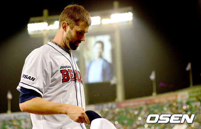 8회초 한화 공격을 삼자범퇴로 막아낸 두산 투수 니퍼트가 더그아웃으로 들어가고 있다.