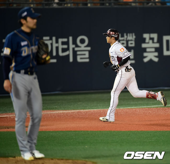 12일 오후 서울 목동야구장에서 열린 '2014 한국야쿠르트 세븐 프로야구' 넥센 히어로즈와 NC 다이노스의 경기, 9회말 1사 주자 2루 넥센 문우람이 우월 투런 홈런을 날린 후 그라운드를 돌고 있다.