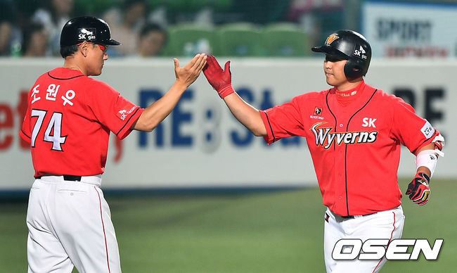 12일 오후 대구구장에서 열린 2014 한국야쿠르트 세븐 프로야구 삼성 라이온스와 SK 와이번스의 경기 9회초 2사 1,3루 SK 최정이 3점 홈런을 날리고 조원우 코치와 하이파이브를 하고 있다. 최정은 이날 4타수 1홈런 포함 4안타 5타점 3득점 활약했다.