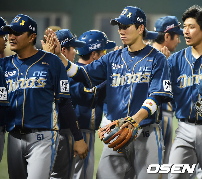 경기를 마치고 NC 모창민이 코치진들과 하이파이브를 하고 있다. / rumi@osen.co.kr