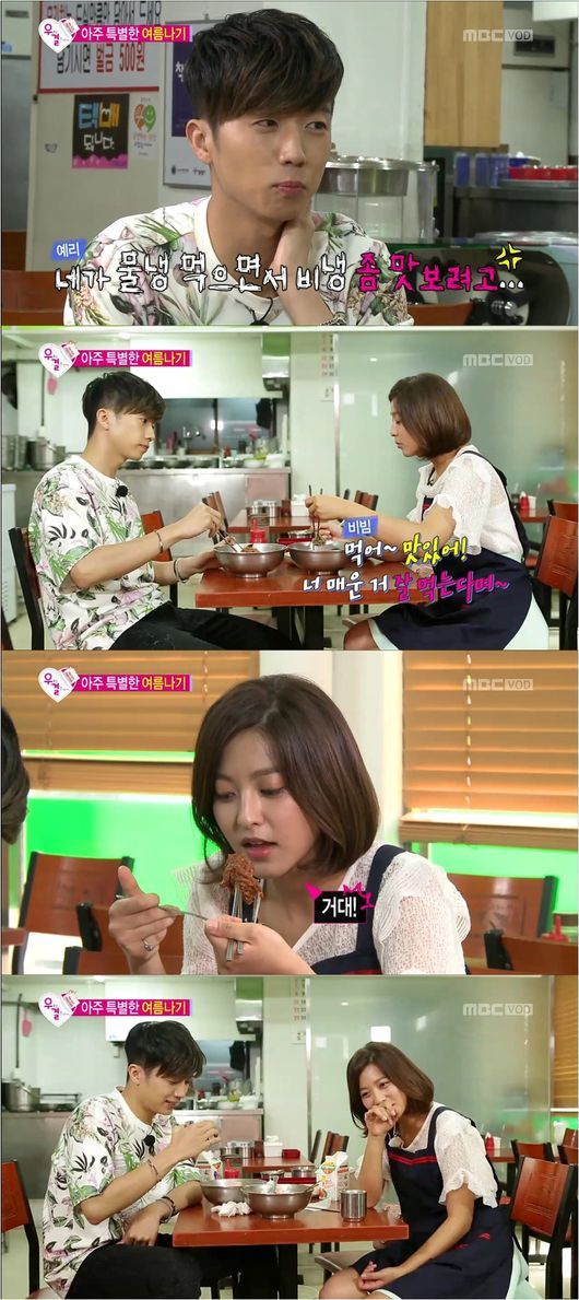 우영은 “네가 물 냉면을 먹으면서 비빔 냉면을 맛보고 싶어서 그렇게 시킨 거지?”라고 칭얼거렸다. 결국 우영은 매운 음식을 잘 먹는 박세영에게 복수하겠다고 양념장을 잔뜩 넣어 먹기 대결을 벌였다. 소원권 획득을 걸고 서로에게 먹여주면서 기싸움을 벌인 것. 비교적 매운 음식을 잘 먹는 박세영과 달리 땀을 빼고 입이 퉁퉁 부울 정도로 정신이 혼미해진 우영의 모습은 웃음을 안겼다.