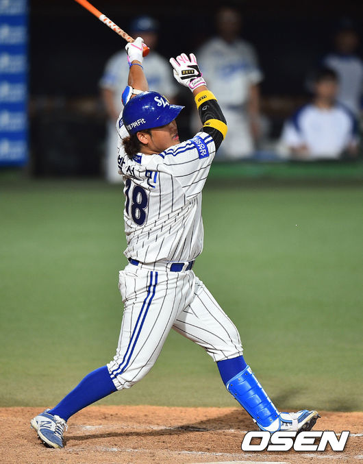 12일 오후 대구구장에서 열린 2014 한국야쿠르트 세븐 프로야구 삼성 라이온스와 SK 와이번스의 경기 9회말 2사 1루 삼성 박석민이 2점 홈런을 날리고 있다. 박석민은 이 홈런으로 통산 66번째 500타점을 기록했다.