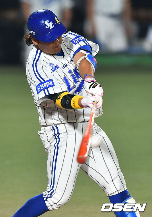 12일 오후 대구구장에서 열린 2014 한국야쿠르트 세븐 프로야구 삼성 라이온스와 SK 와이번스의 경기 9회말 2사 1루 삼성 박석민이 2점 홈런을 날리고 있다. 박석민은 이 홈런으로 통산 66번째 500타점을 기록했다.