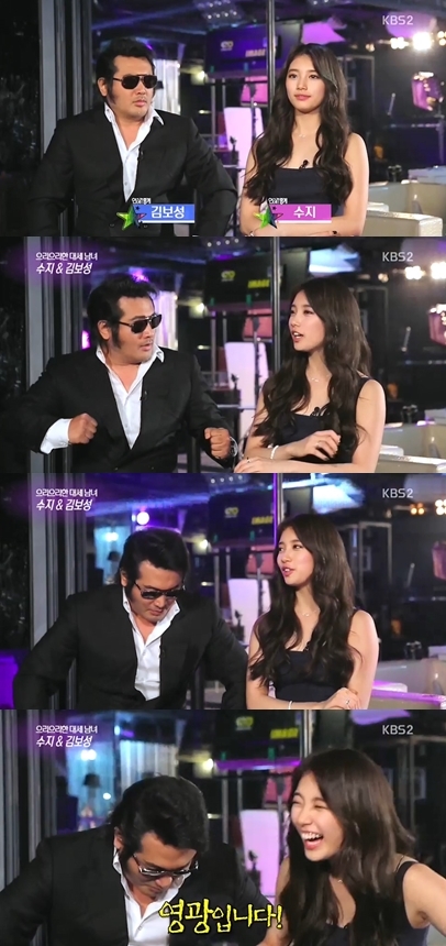 수지는 12일 방송된 KBS 2TV '연예가중계'에서 김보성과 광고촬영 중 진행된 인터뷰를 통해 ‘국민 첫사랑’이라는 수식어에 대한 어떻게 생각하냐는 리포터의 질문에 “좋다. 내가 언제 이런 걸 들어보겠냐”며 만족감을 드러냈다.