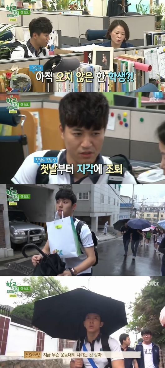 '학교 다녀오겠습니다'의 김종민과 브라이언, 혜박 등 연예인 학생들이 등교 첫날부터 대거 지각했다.