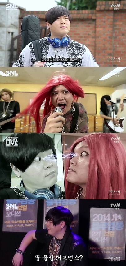 [OSEN=정소영 인턴기자] 12일 오후 방송된 tvN 'SNL 코리아' 속 '스쿨 오브 락' 코너에서는 락으로 경쟁하는 문희준과 김민교의 모습이 그려졌다.