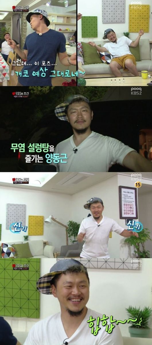 양동근은 12일 오후 11시 25분 방송된 KBS 2TV '인간의 조건'에서 개코의 초대로 저염식 요리 대결 심사위원으로 출연했다.