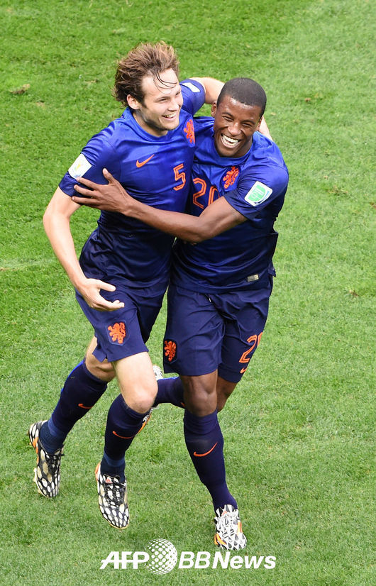 [OSEN=사진팀] 13일 오전(한국시간) 브라질 나시오날 경기장에서 벌어진 '2014 브라질월드컵' 3-4위전 브라질과 네덜란드의 경기,전반 블린트가 두번째 골을 넣고 환호하고 있다.