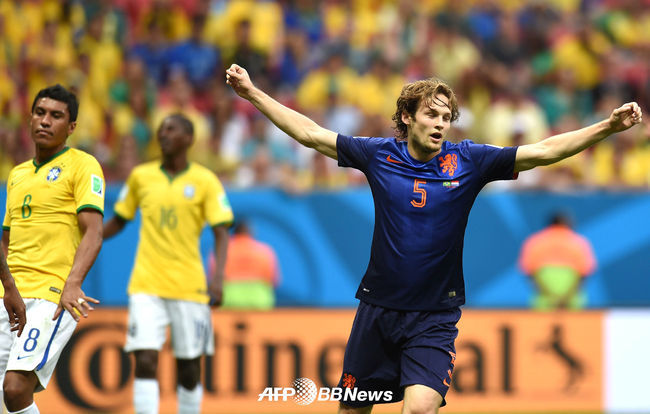 [OSEN=사진팀] 13일 오전(한국시간) 브라질 나시오날 경기장에서 벌어진 '2014 브라질월드컵' 3-4위전 브라질과 네덜란드의 경기,전반 블린트가 두번째 골을 넣고 환호하고 있다.