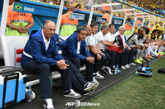 [OSEN=사진팀] 13일 오전(한국시간) 브라질 나시오날 경기장에서 벌어진 '2014 브라질월드컵' 3-4위전 브라질과 네덜란드의 경기,전반 블린트가 두번째 골을 넣자 브라질 스콜라리 감독과 선수들이 침묵하고 있다.