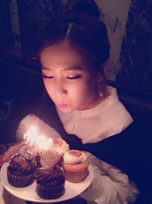공개된 사진 속 초아는 숫자 ‘2’, ‘5’ 모양의 초가 꽂힌 컵케이크를 들고 있다. 불을 끄려는 듯 입술을 모은 그의 모습이 단아하면서도 귀엽다.