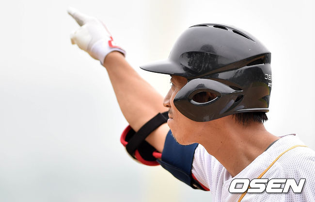 5회말 1사 2루에서 SP페퍼스 이용진이 적시타를 치고 환호하고 있다.