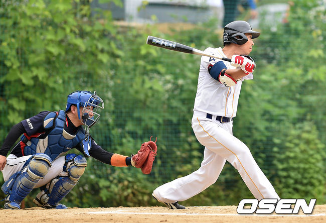 5회말 1사 2루에서 SP페퍼스 이용진이 적시타를 치고 있다.