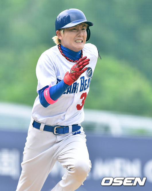 1회초 1사에서 폴라베어스 고유진이 내야땅볼을 치고 그라운드를 달리고 있다.