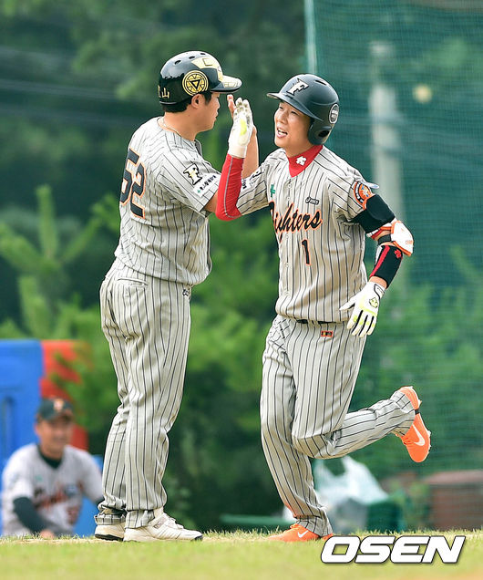 1회말 1사 1루에서 풍산베어스 김정민이 투런 홈런을 치고 그라운드를 달리고 있다.