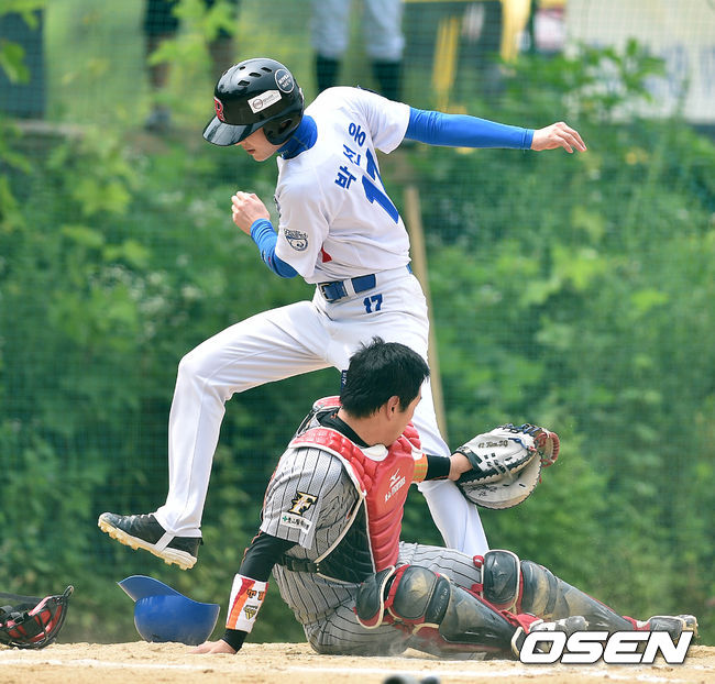 2회말 2사 3루에서 폴라베어스 박정재의 내야땅볼때 홈으로 쇄도한 3루주자 박선웅이 홈에서 아웃되고 있다.