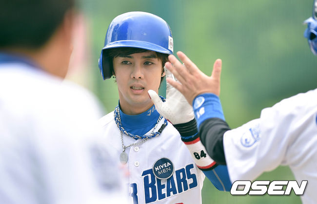 3회초 1사 2,3루에서 폴라베어스 성유빈이 2타점 적시타를 치고 송구가 빠진틈을 타 홈을 밟으며 동료들과 환호하고 있다.