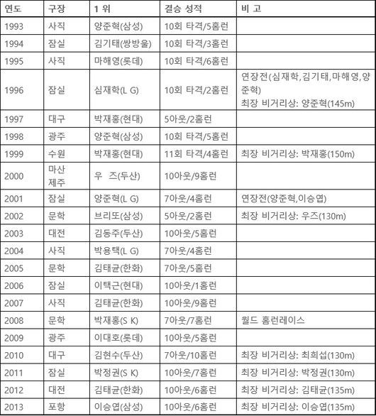 한편, 1993년부터 시작된 올스타전 홈런레이스는 양준혁(전 삼성)과 박재홍(전 SK), 한화 김태균이 통산 3차례로 최다 우승 기록을 보유하고 있다.