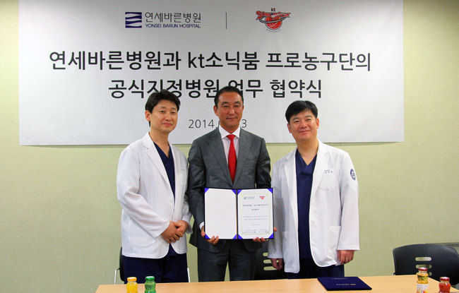 연세바른병원(서울 동작구 사당동)은 KT 선수단의 체계적인 건강관리와 부상방지, 응급조치, 재활치료 등 지속적인 의료 서비스를 할 예정이다. 연세바른병원은 경막외 내시경 레이저, 고주파 수핵 감압술 등 수술 없이도 부상부위를 시술 할 수 있는 척추관절 전문 병원이다.