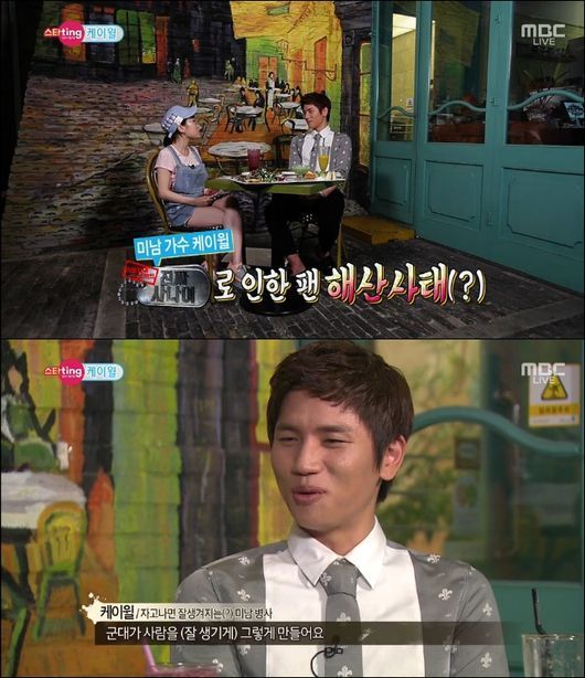 케이윌은 "집에서 자고 일어나면 안 그런데 군대가 사람을 (못생겨 보이게) 만든다"고 말해 웃음을 자아냈다. 이어 "나조차도 '진짜 사나이'를 보다가 채널을 바꿨다"고 밝혔다.