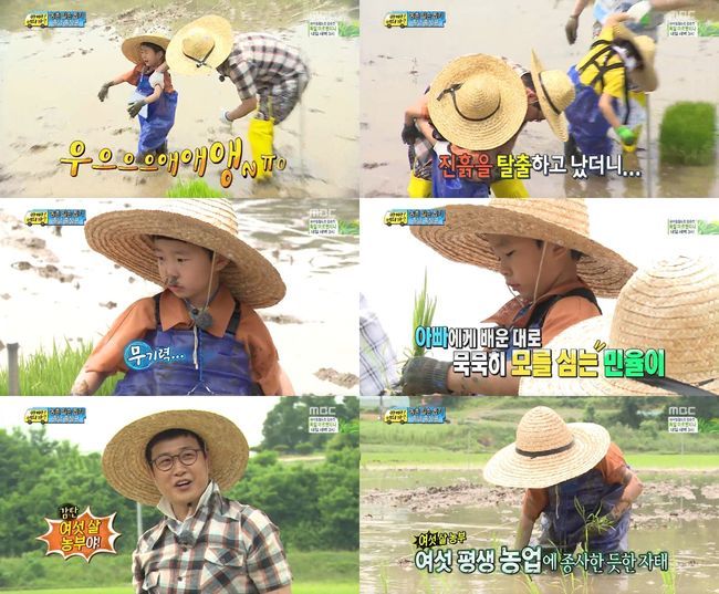 하지만 어느 정도 시간이 흐르자 아빠들도 아이들도 모내기에 익숙해졌다. 신이 나 모를 심는 김민율을 보며 김성주는 “여섯 살 농부”라며 칭찬을 했다. 아빠 칭찬을 받은 김민율은 이후 더욱 흥에 겨워 일을 계속해 훈훈함을 자아냈다.