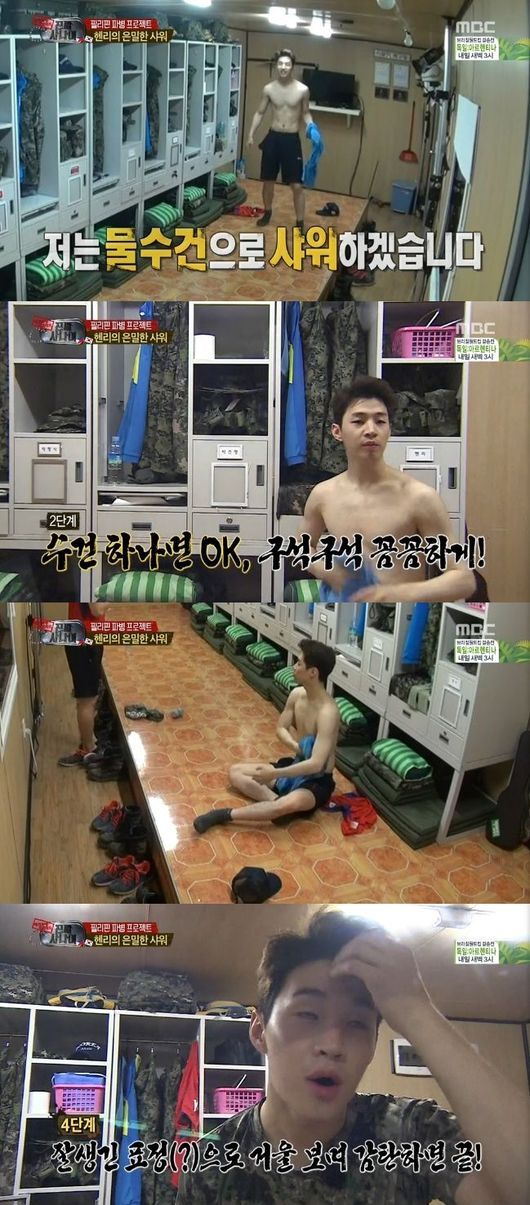 헨리는 13일 오후 방송된 MBC 예능프로그램 '일밤-진짜사나이'(이하 '진짜사나이')에서 아침 샤워 대신 물수건 샤워를 택했다.