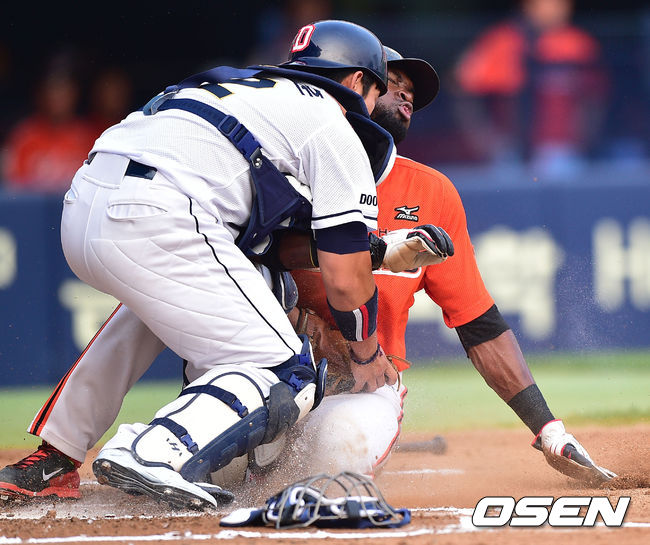 13일 오후 서울 잠실구장에서 열린 2014 한국야쿠르트 세븐 프로야구 두산 베어스와 한화 이글스의 경기,2회초 1사 2,3루 한화 이학준의 내야땅볼때 3루 주자 피에가 홈에서 최재훈 포수에게 태그아웃되고 있다.
